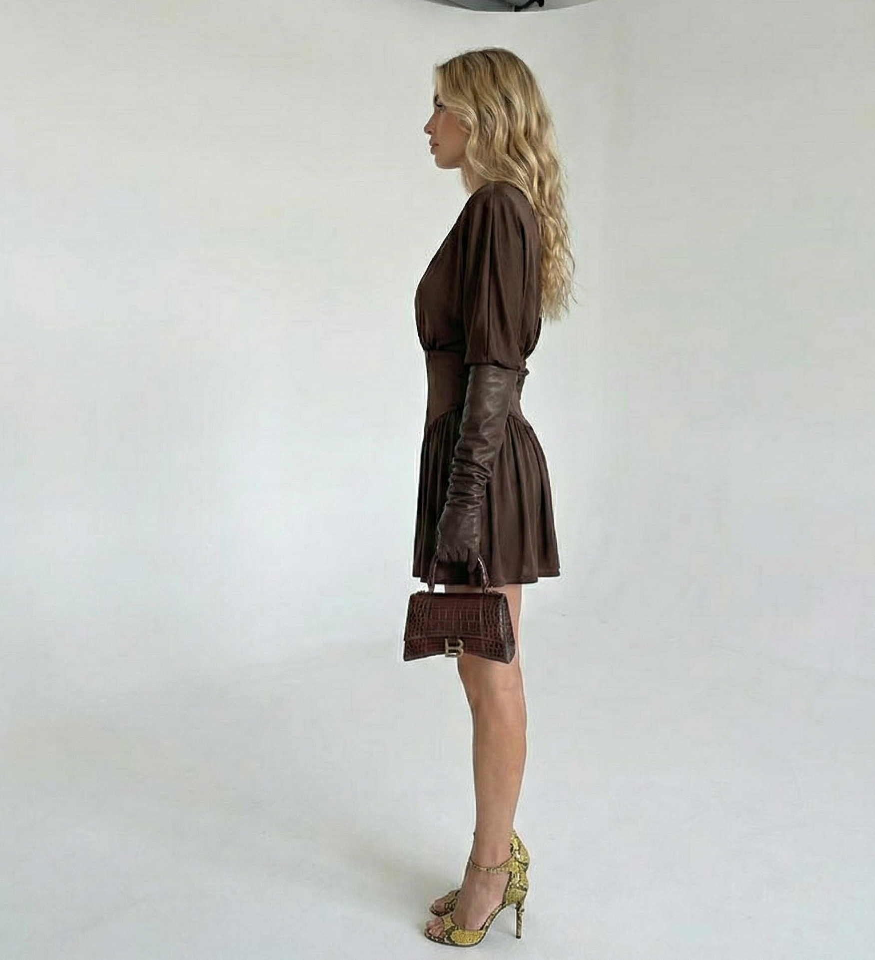 Brun kjole med satengeffekt og stram midje