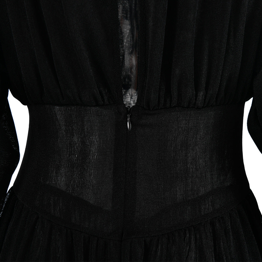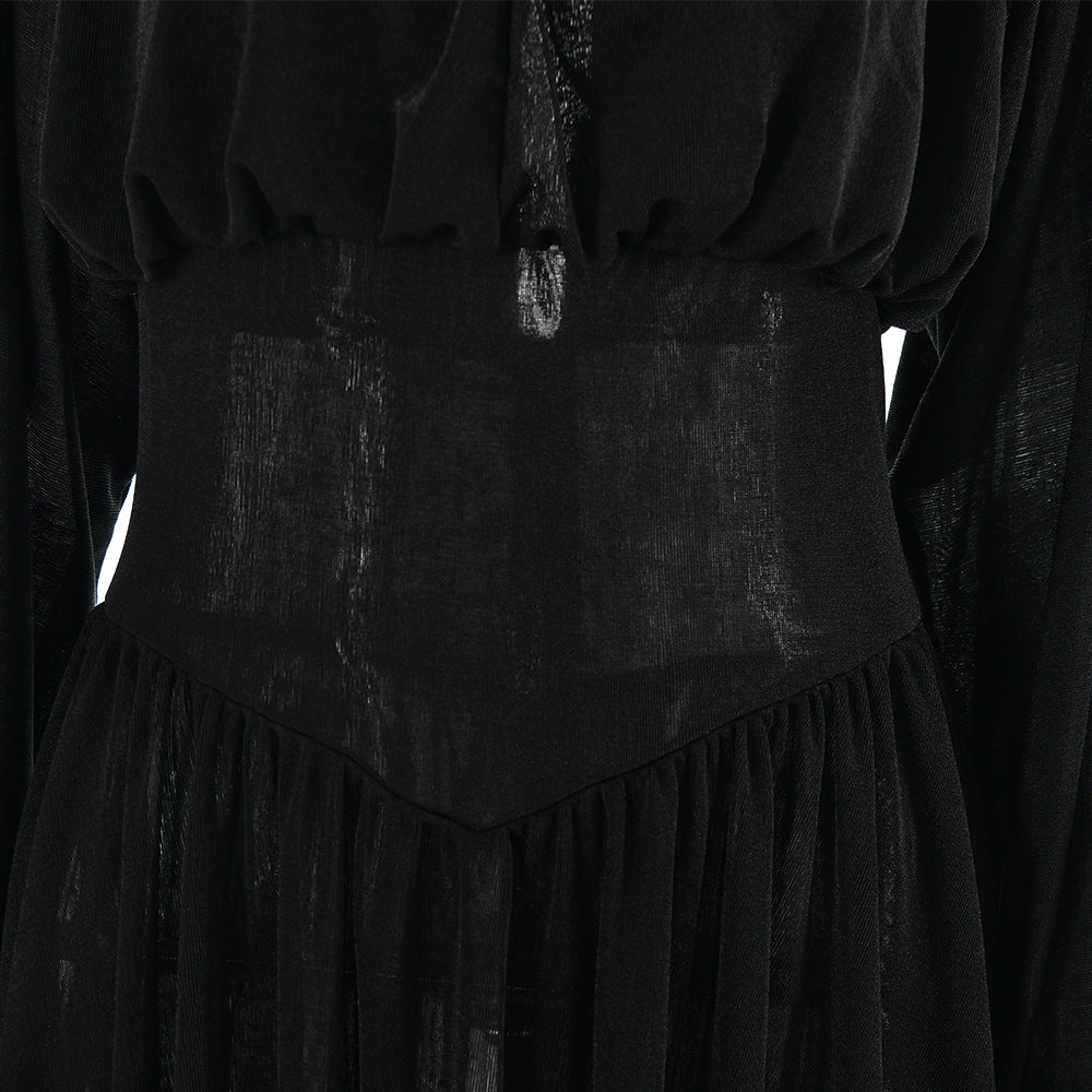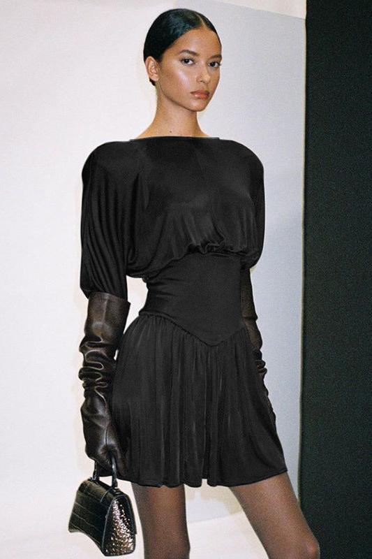 Kort kjole med en elegant satengfinish, med et flytende design på toppen og et lett plissert skjørt. Den skiller seg ut med sin knipede midje med korsettdetaljer og puffede ermer.