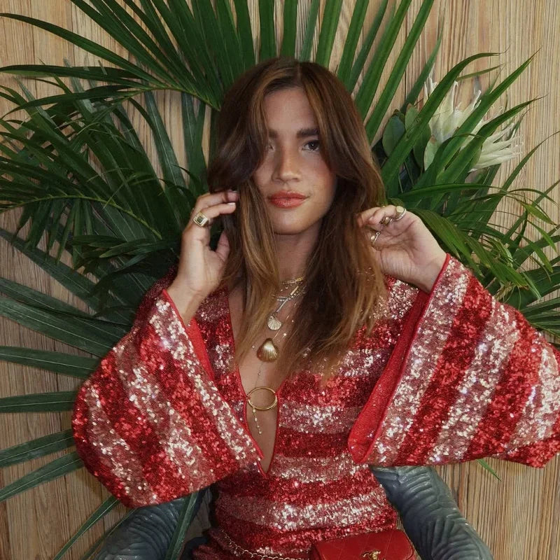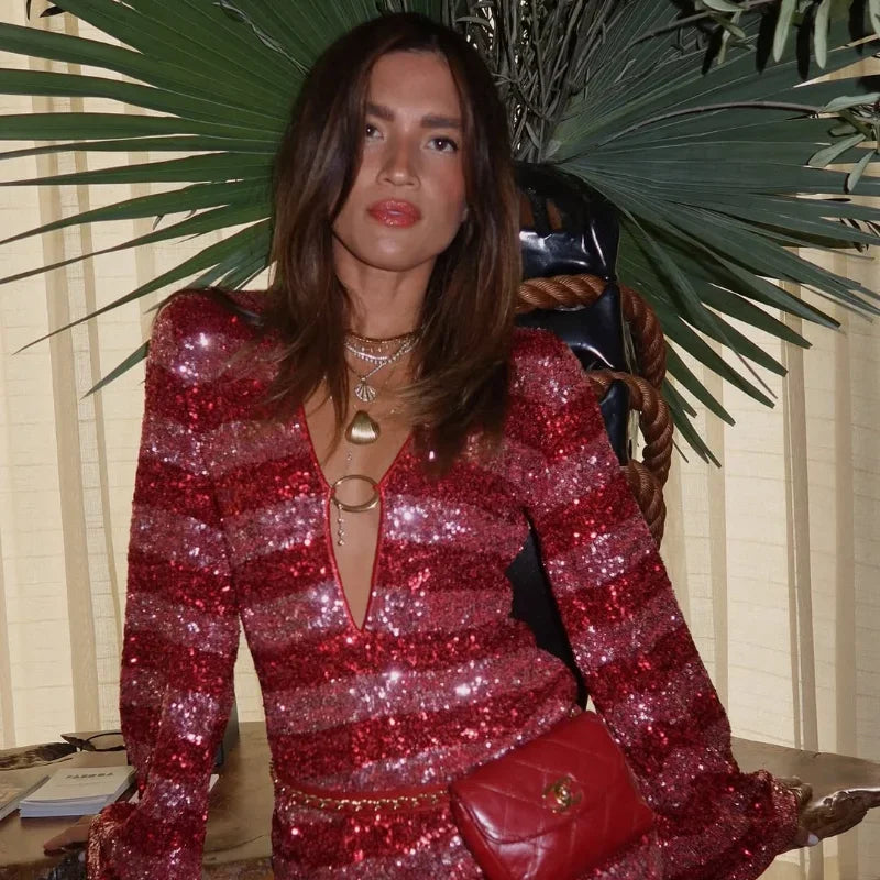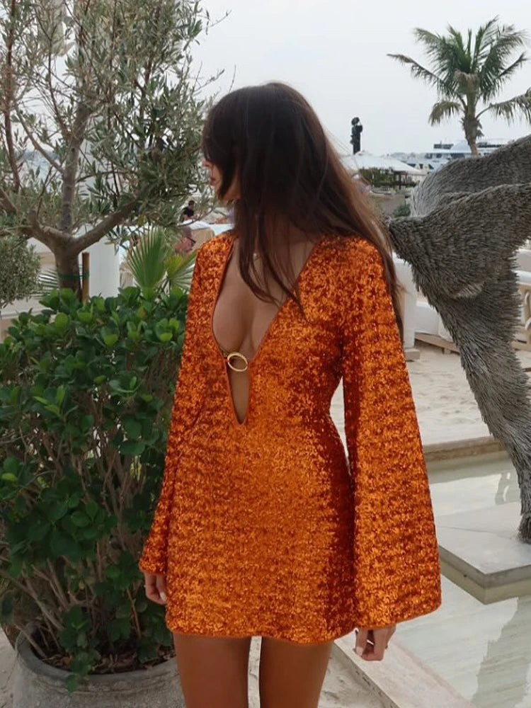 Импацт мини хаљина у живописној наранџастој боји прекривена шљокицама, идеална да заблиста у свакој посебној прилици. Дизајниран са дубоким изрезом у облику слова В